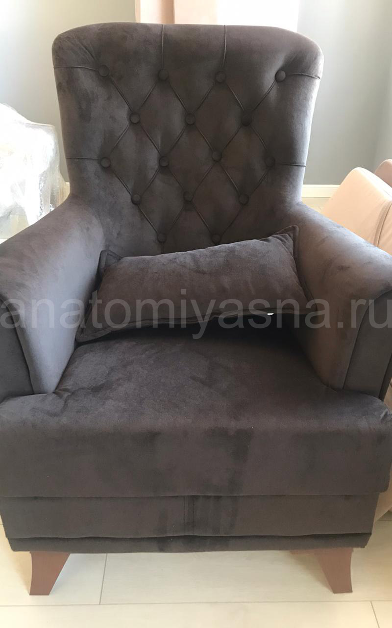 Симпатичное кресло, кантики и пуговицы, как декоративная отделка в одной ткани. Посадка удобная.